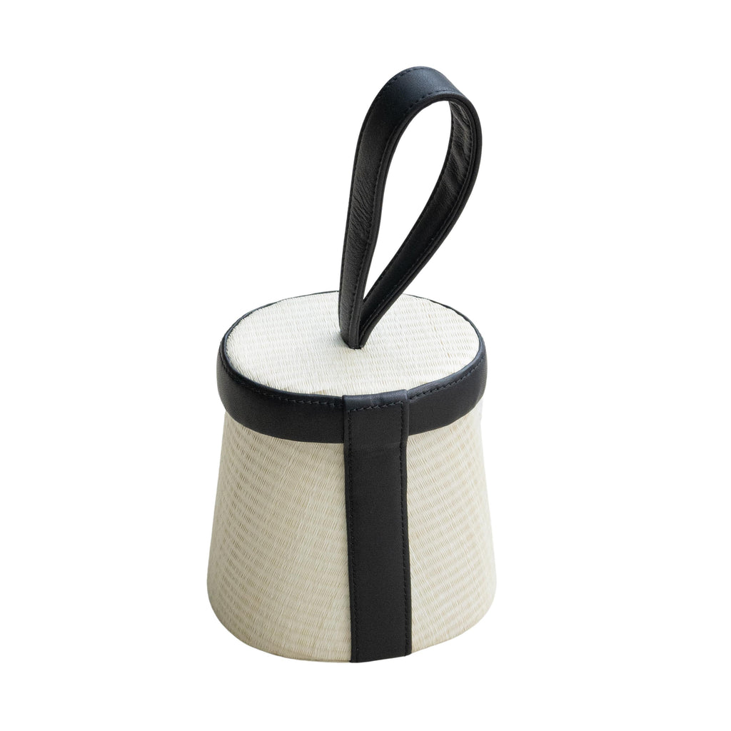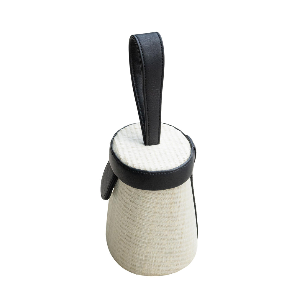 Carlie, with its cool inverted bucket shape, is made with natural Buntal fiber sourced directly from farmers and weavers in Marinduque province. It is trimmed with sheepskin leather with a built-in wrist strap or handle.